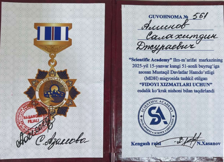 2025-yilda S.D. Aminov professorlik diplomi, shuningdek, 2 ta davlat mukofoti: Fidoyi xizmatlari uchun va Sog’likni saqlash a’lochisi mukofotlarga sazovor bo‘ldi.