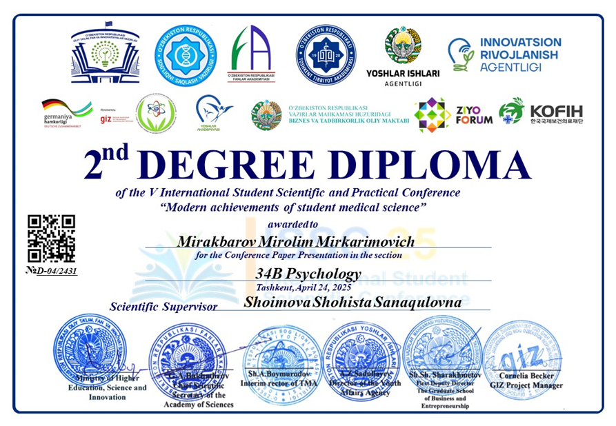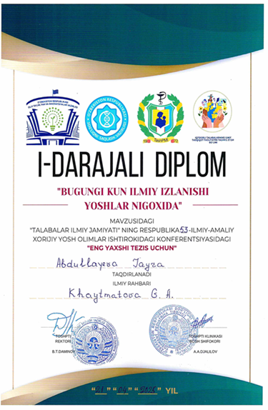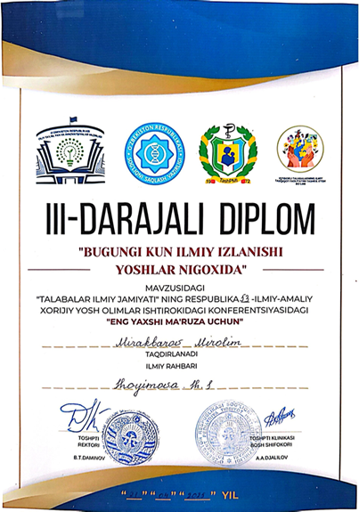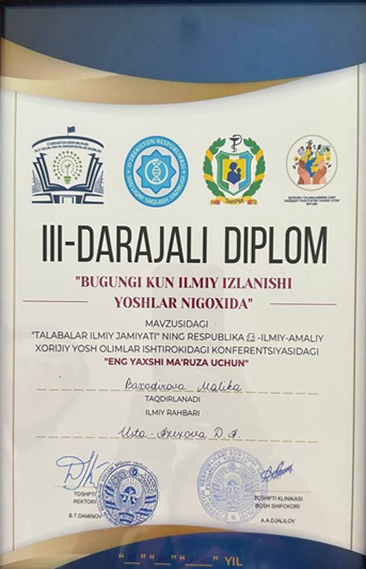 2025 yil 21 aprel kuni Toshkent pediatriya tibbiyot instituti Talabalar Ilmiy Jamiyatining an’anaviy “Bugungi kun ilmiy izlanishi yoshlar nigoxida 2025″ mavzusidagi 53-Respublika ilmiy konferentsiyasi Eng yaxshi DOKLАD, 3 darajali diplom bilan: